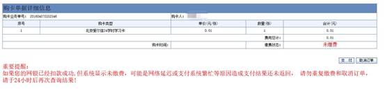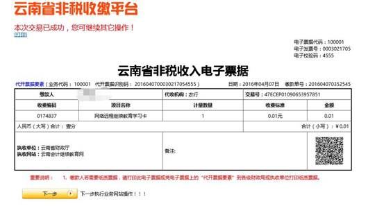 支付完成以后會顯示電子票據(jù),請保存好電子票據(jù),同時請點擊下一步,發(fā)送繳費通知,否則由于系統(tǒng)收不到繳費通知,可能不會分配卡號。