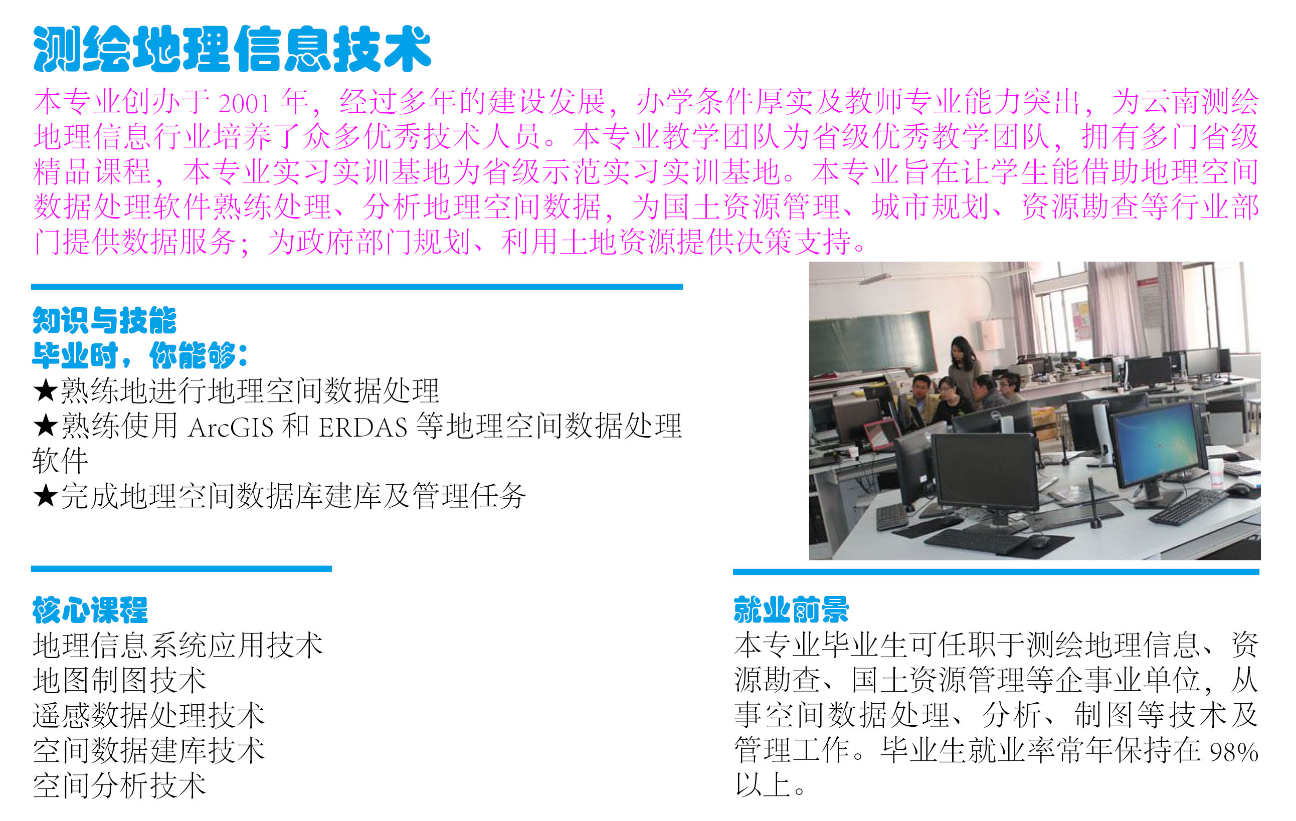 測繪地理信息學(xué)院依據(jù)測繪地理信息產(chǎn)業(yè)發(fā)展對技術(shù)人才的需求,立足云南、面向西部地區(qū)設(shè)置相應(yīng)專業(yè),目前開設(shè)"地理信息系統(tǒng)與地圖制圖技術(shù)"、"測繪工程技術(shù)"、"地籍測繪與土地管理信息技術(shù)"、"工程測量與監(jiān)理"四個專業(yè);專業(yè)設(shè)置得到省教育主管部門、行業(yè)企業(yè)、學(xué)生及家長的高度認(rèn)可。2011年度,系在校生人數(shù)達(dá)到1360人,是學(xué)院12個院系中學(xué)生人數(shù)最多的系,同時也是云南省高等學(xué)校中測繪地理信息類專業(yè)學(xué)生人數(shù)最多的院系。