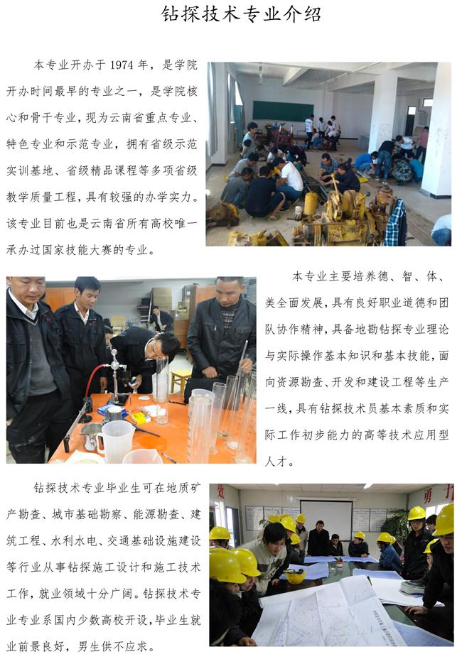 應用工程學院現(xiàn)設置有鉆探技術(shù)、基礎工程技術(shù)、安全技術(shù)管理、環(huán)境監(jiān)測與治理技術(shù)、金屬礦開采技術(shù)等5個專業(yè),長期致力為云南省區(qū)域經(jīng)濟發(fā)展培養(yǎng)急缺的高等技術(shù)應用型人才。在十幾年的發(fā)展過程中,應用工程學院始終遵循“以能力為導向”的高等職業(yè)教育辦學要求,立足產(chǎn)業(yè)行業(yè)發(fā)展,面向生產(chǎn)實際需要,強化校企合作,深化專業(yè)教育教學改革,開設的專業(yè)均構(gòu)建了以工作過程系統(tǒng)化的課程體系,形成了工學結(jié)合的人才培養(yǎng)模式,專業(yè)教育教學改革成果成果豐碩,人才培養(yǎng)質(zhì)量提到不斷提升。其中,鉆探技術(shù)專業(yè)現(xiàn)為云南省重點專業(yè)、特色專業(yè)和省級示范專業(yè),建有校內(nèi)、校外省級示范實習實訓基地各1個,省級精品課程1門,校級精品課程5門,辦學實力為國內(nèi)相同專業(yè)最強。依托于該專業(yè),學校多次承辦云南省鉆探技能大賽,2011年11月還成功承辦了第一屆全國地勘鉆探職業(yè)技能大賽,獲得國家相關(guān)部委的表彰。2014年,安全技術(shù)管理專業(yè)成功申報“云南省高職院校提升專業(yè)服務產(chǎn)業(yè)能力建設項目”,獲得省財政廳和教育廳150萬元的建設資金。同時,依托云南省世行貸款高職院校建設項目,基礎工程技術(shù)、環(huán)境監(jiān)測與治理技術(shù)和金屬礦開采技術(shù)等專業(yè)在專業(yè)建設和實訓條件建設上得到大額資金的支持,專業(yè)辦學實力都將得到較大提升。