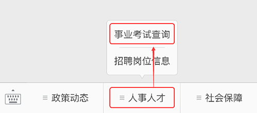 1 )點(diǎn)擊公眾號(hào)底部的【人事人才】菜單,再點(diǎn)擊【事業(yè)考試查詢】,如下圖所示