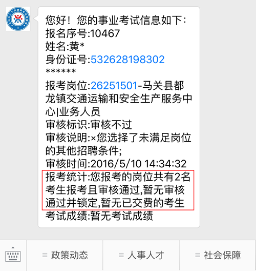 2 )微信公眾號(hào)會(huì)顯示您所報(bào)崗位的報(bào)考情況,如下圖所示