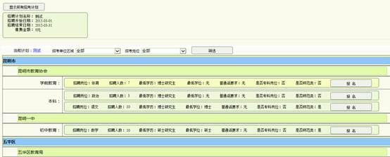 6、同意招考協(xié)議書之后,可以看到相關(guān)的招考崗位,考生可以自行篩選合適的單位區(qū)域和學(xué)科,對中意的崗位如果自身情況滿足最低報名要求可以直接點擊進行報名。