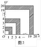 13. 將邊長分別為1、2、3、4、…、19、20的正方形置于直角坐標系第一象限,如圖5中方式疊放,則按圖示規(guī)律排列的所有陰影部分的面積之和為__________.
