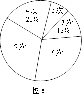 19.(10分)為了解某校九年級男生的體能情況,體育老師隨機抽取部分男生進行引體向上測試,并對成績進行了統(tǒng)計,繪制成圖8和圖9兩幅尚不完整的統(tǒng)計圖.