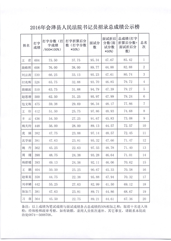 2016年會澤縣人民法院書記員招錄總成績公示榜