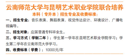 根據(jù)云南省招生考試院有關(guān)文件的規(guī)定,結(jié)合實際情況,2016年云南師范大學(xué)繼續(xù)面向全省高等??茖W(xué)校招收優(yōu)秀應(yīng)屆??飘厴I(yè)生,其中,與昆明藝術(shù)職業(yè)學(xué)院聯(lián)合培養(yǎng)招生專業(yè)如下: