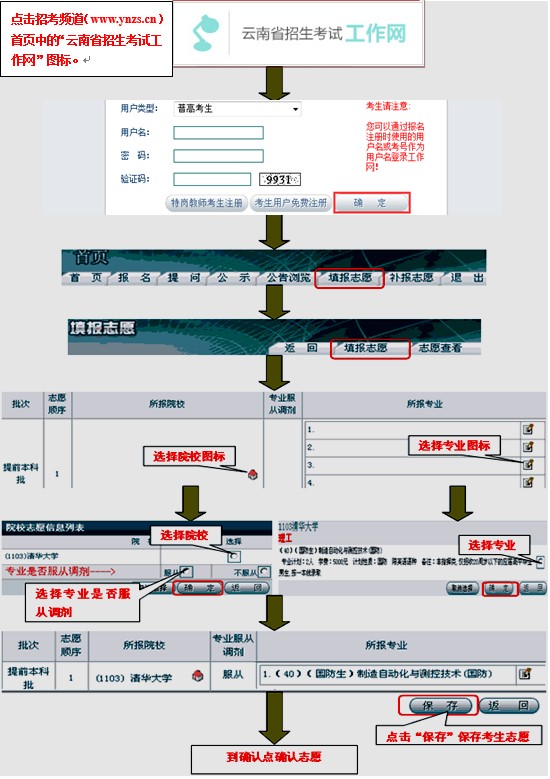 在填報截止時間之前,考生登錄工作網(wǎng)(http://www.ynzs.cn或http://www.ynzk.cn),自行進行志愿填報;在確認截止時間之前,考生攜帶第二代身份證和準考證到確認點進行確認、簽字,完成志愿填報。