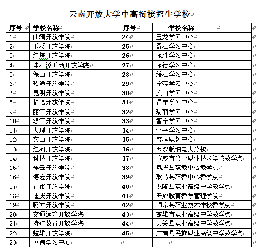 3、招生學(xué)校:經(jīng)批準(zhǔn)開展云南開放大學(xué)中高銜接招生的云南開放大學(xué)各開放學(xué)院、學(xué)習(xí)中心和相關(guān)中職學(xué)校,具體招生學(xué)校名單見第4頁。