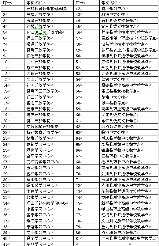 3、招生學(xué)院:由經(jīng)批準(zhǔn)開展遠(yuǎn)程開放教育本科招生的云南開放大學(xué)相關(guān)專業(yè)學(xué)院實(shí)施定點(diǎn)集中招生,具體招生學(xué)院名單: