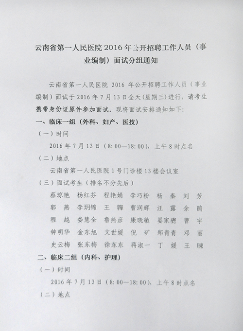 云南省第一人民醫(yī)院2016年招聘(事業(yè)編)面試分組通知