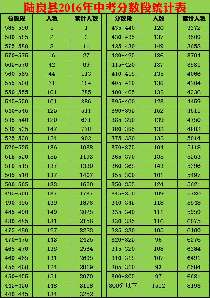 陸良縣2016年中考分?jǐn)?shù)段統(tǒng)計(jì)表