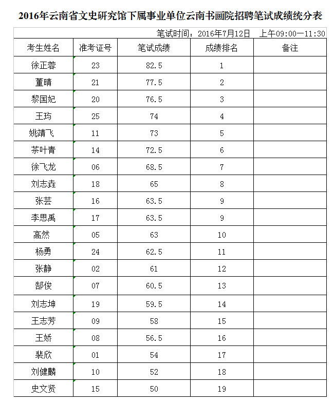 云南書畫院招聘筆試成績統(tǒng)分表