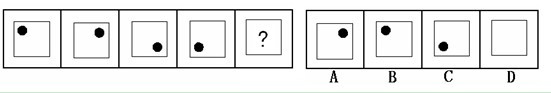 (答案:B。黑點(diǎn)在正方形中順時(shí)針移動(dòng)。在第5個(gè)圖形中,應(yīng)該正好移動(dòng)到左上角。)