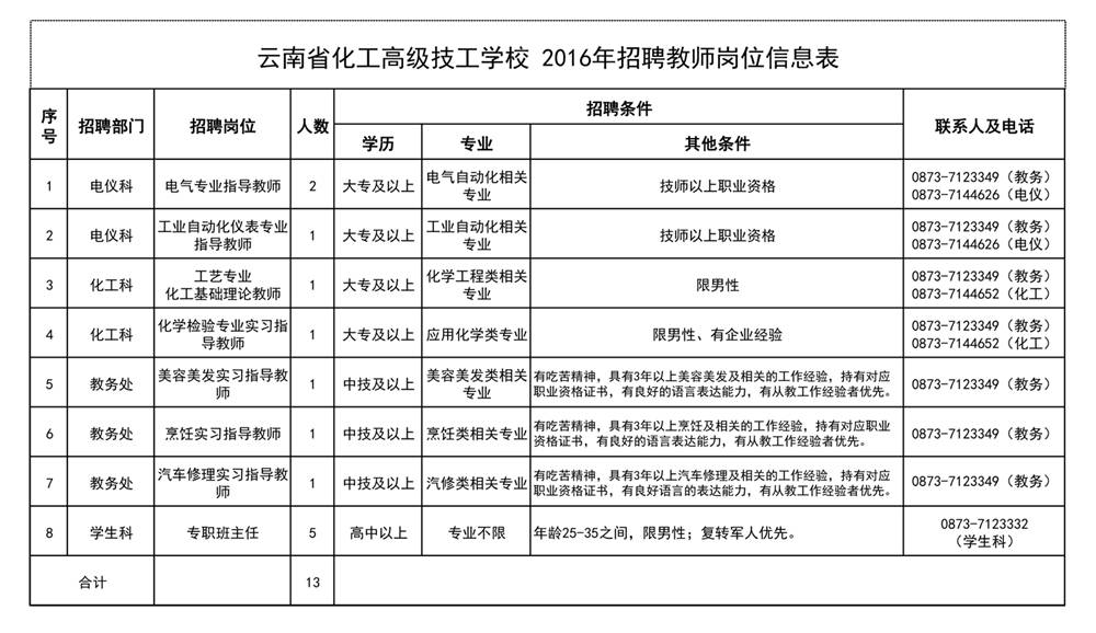 云南省化工高級技工學(xué)校隸屬于云南省人力資源和社會保障廳,是一所集全日制技工教育和職業(yè)技能培訓(xùn)鑒定為一體的技工院校,位于紅河州開遠(yuǎn)市市西北路299號。為了進(jìn)一步加強(qiáng)我校師資隊(duì)伍建設(shè),促進(jìn)學(xué)校各項(xiàng)事業(yè)的發(fā)展,經(jīng)學(xué)校研究決定面向社會公開招聘編制外教師13人。現(xiàn)將有關(guān)事項(xiàng)公告如下: