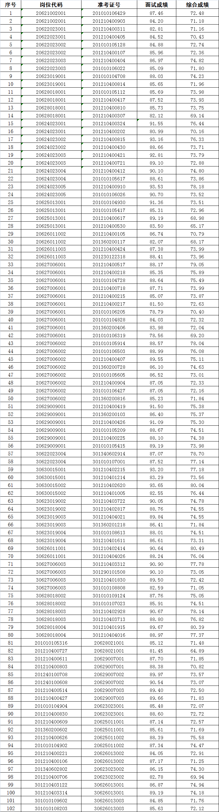 2016年昭通市法檢系統(tǒng)考試錄用公務(wù)員考生 面試成績及綜合成績公告 根據(jù)《2016年昭通市法檢系統(tǒng)考試錄用公務(wù)員面試及后續(xù)工作安排的公告》,我市法檢系統(tǒng)考生于7月15日進行了面試。法院系統(tǒng)考生參加面試人員80人,檢察院系統(tǒng)考生參加面試人員22人?,F(xiàn)將考生面試成績及綜合成績公布如下: