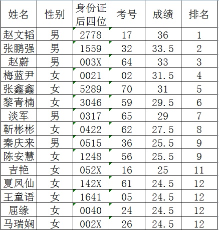根據(jù)筆試成績從高分到低分的順序按招聘人數(shù)1:3的比例確定15名考生進(jìn)入面試(筆試成績并列的,均進(jìn)入面試),名單如下: