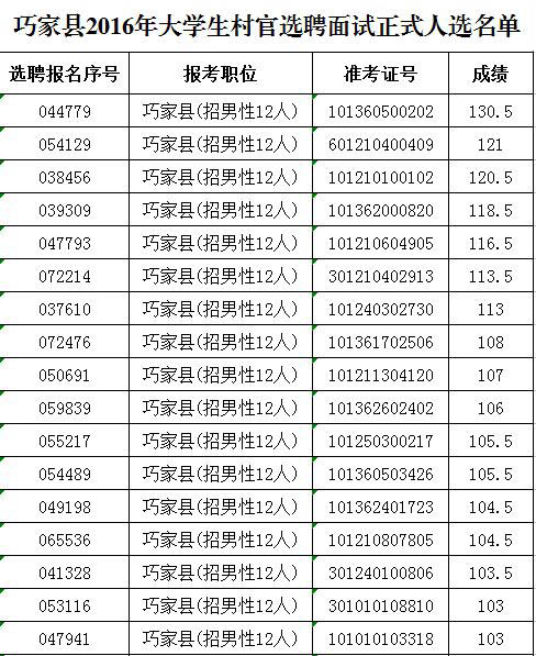 附件:巧家縣2016年大學(xué)生村官選聘面試正式人選名單