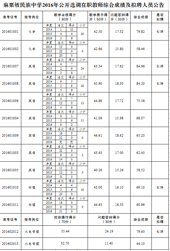 麻栗坡民族中學(xué)2016年選調(diào)在職教師綜合成績及擬聘人員公告