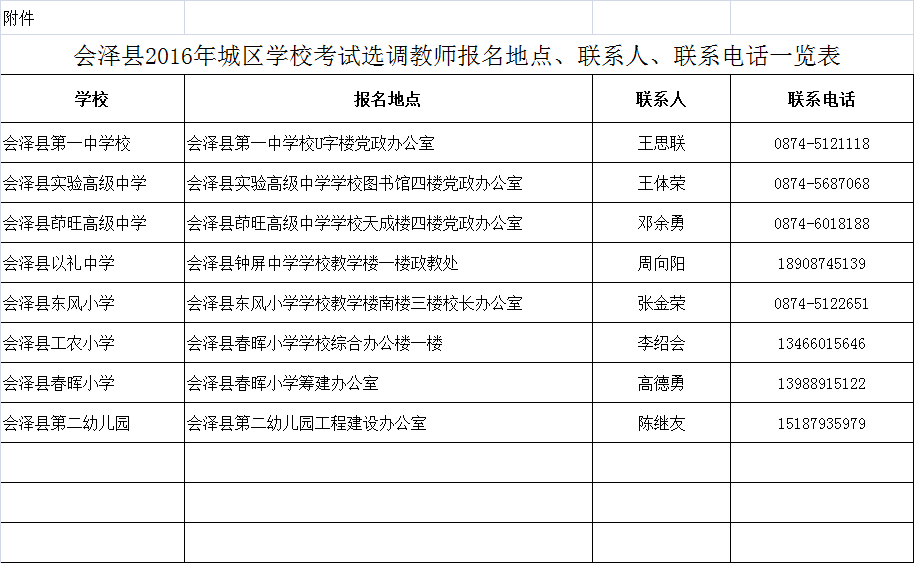 2.報名地點。報考學(xué)校管理崗位的在會澤縣教育局組織人事科,其余報考崗位在相應(yīng)報考學(xué)校進(jìn)行(具體地點、聯(lián)系人、聯(lián)系電話見附表)。
