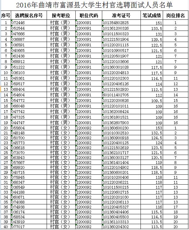 (2016年曲靖市富源縣大學(xué)生村官選聘面試人員名單)