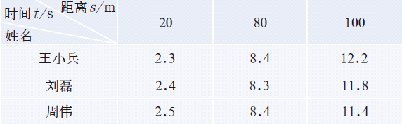 (1)學(xué)校運(yùn)動(dòng)會(huì)男子100m賽,同學(xué)們測(cè)量了前三名運(yùn)動(dòng)員到達(dá)距起點(diǎn)20m、80m和100m處的時(shí)間,數(shù)據(jù)見下表。