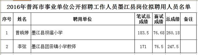 一、2016年普洱市事業(yè)單位公開(kāi)招聘工作人員墨江縣崗位考試根據(jù)考生報(bào)考崗位的總成績(jī)排名,按照從高到低的順序以1:1的比例經(jīng)體檢、考核合格后確定擬聘用人員(擬聘用人員名單附后)。