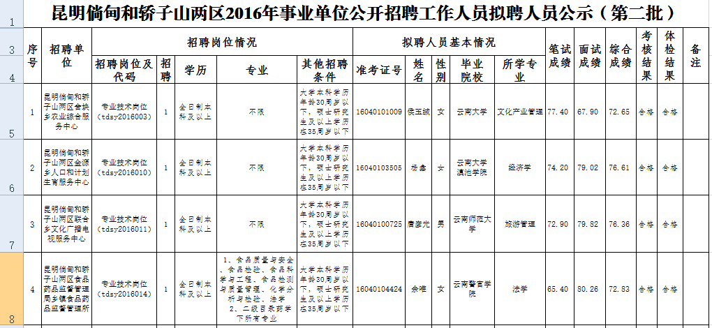 昆明倘甸和轎子山兩區(qū)2016年事業(yè)單位 公開招聘工作人員擬聘人員公示(第二批)