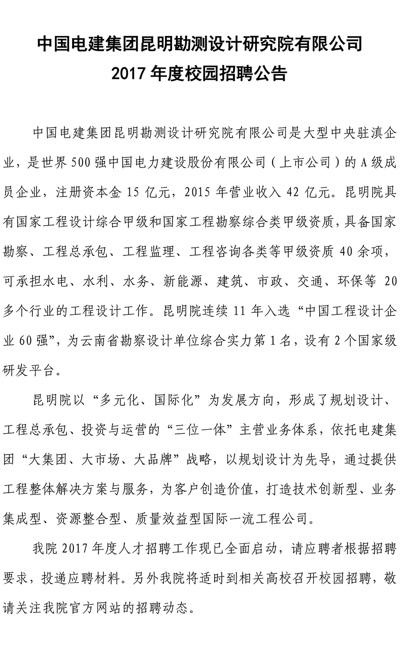 中國電建集團昆明勘測設計研究院有限公司2017年度校園招聘公告