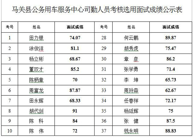 根據(jù)《馬關(guān)縣公務(wù)用車(chē)制度改革實(shí)施方案》(馬辦發(fā)〔2016〕113號(hào))及《馬關(guān)縣公務(wù)用車(chē)服務(wù)中心司勤人員考核選用工作實(shí)施方案》(馬車(chē)改辦發(fā)〔2016〕2號(hào))文件要求,馬關(guān)縣公務(wù)用車(chē)服務(wù)中心司勤人員考核選用面試工作于2016年10月26日結(jié)束,現(xiàn)將縣公務(wù)用車(chē)服務(wù)中心司勤人員考核選用面試成績(jī)公示如下: