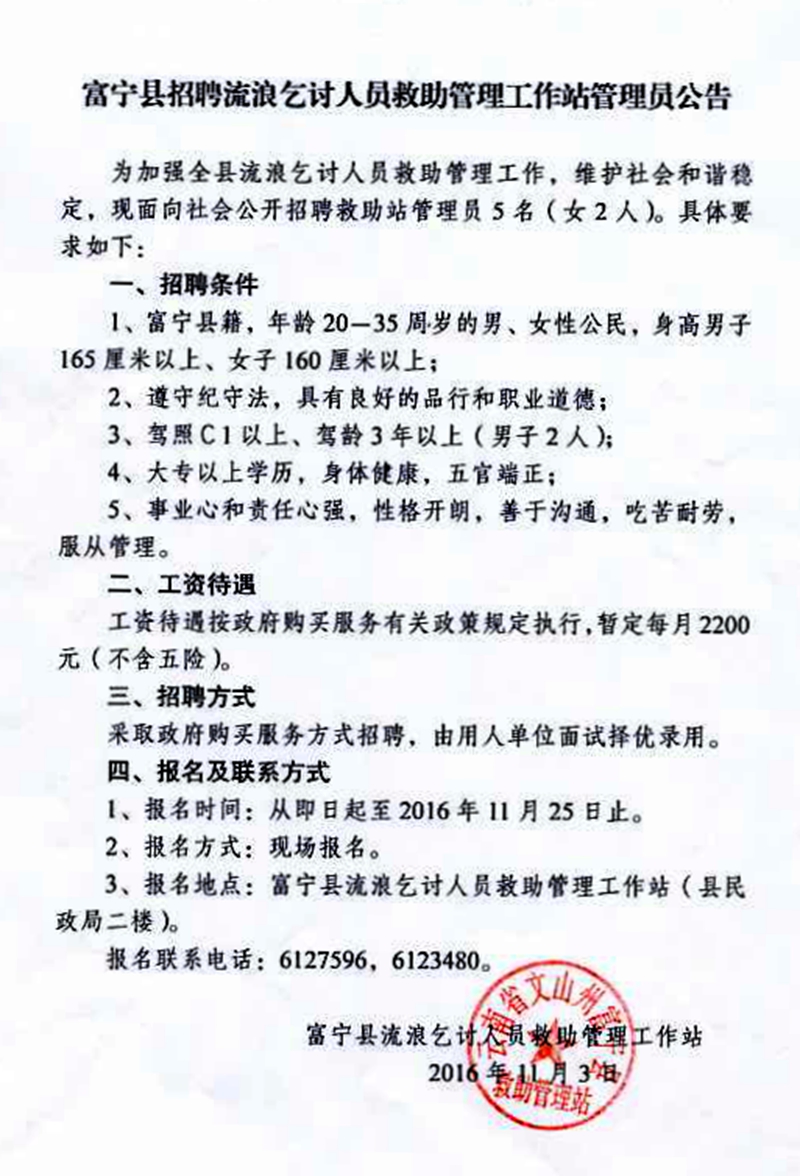 2016年文山州富寧縣招聘流浪乞討人員救助管理工作站管理員公告
