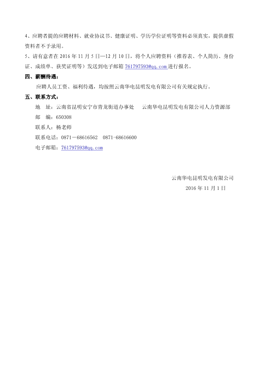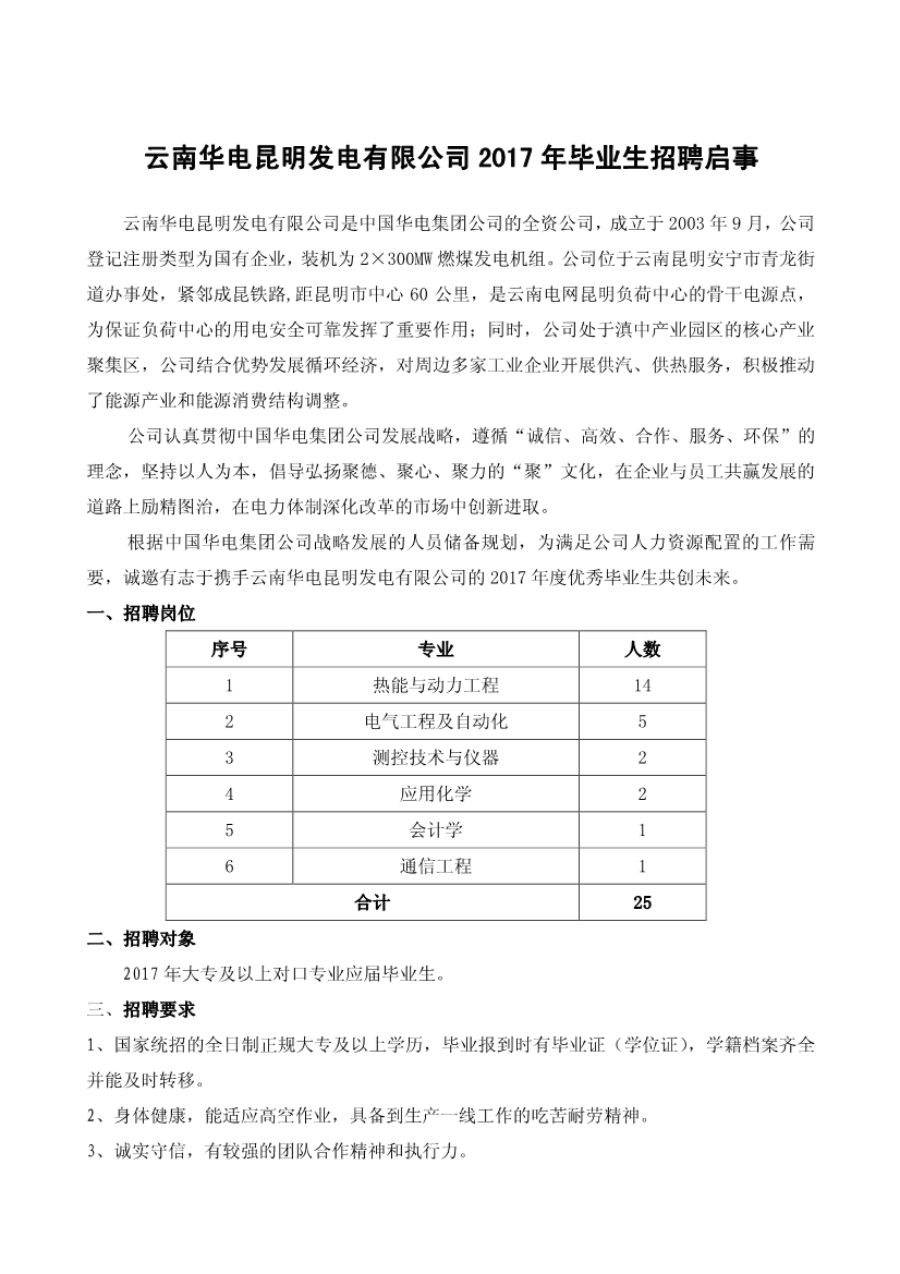 云南華電昆明發(fā)電有限公司2017屆招聘簡章