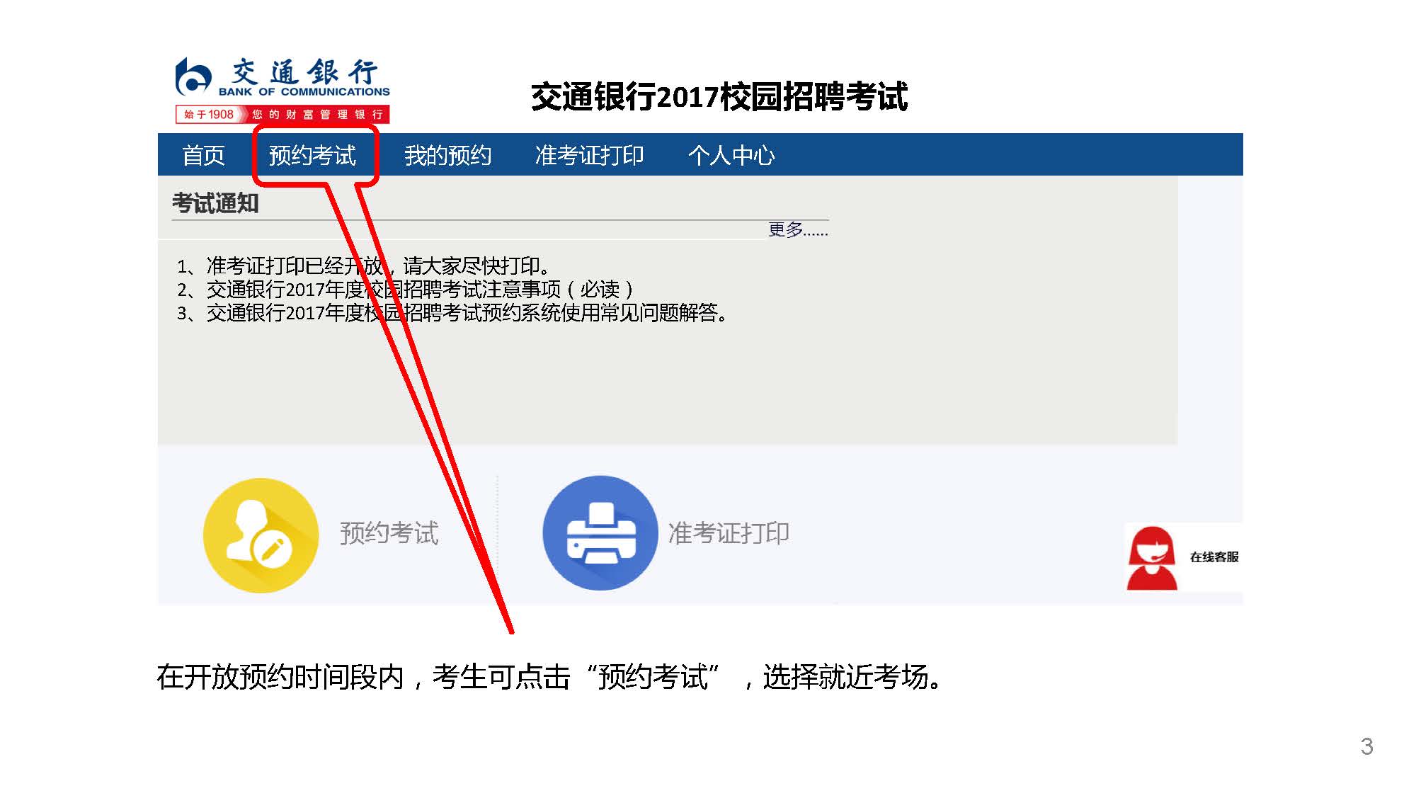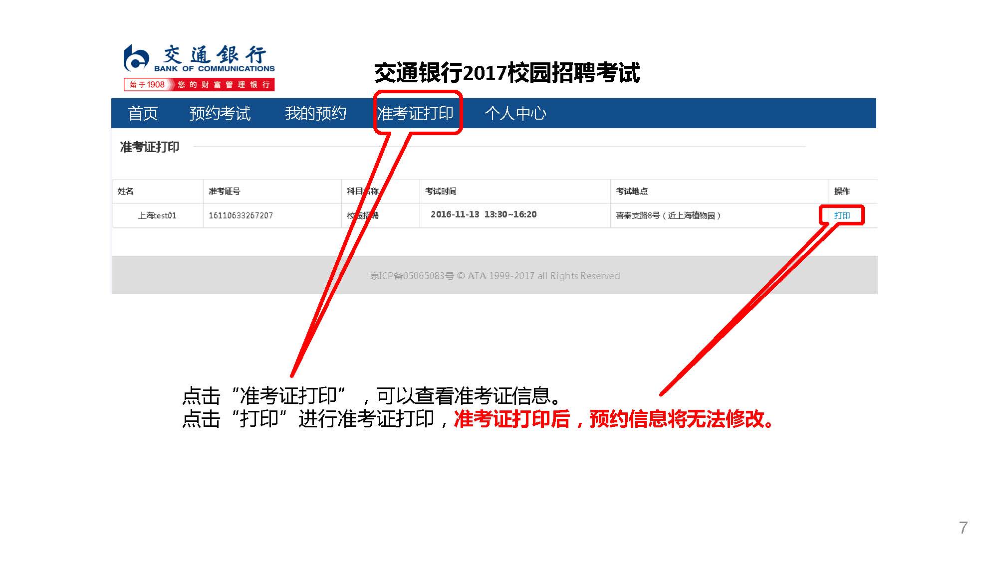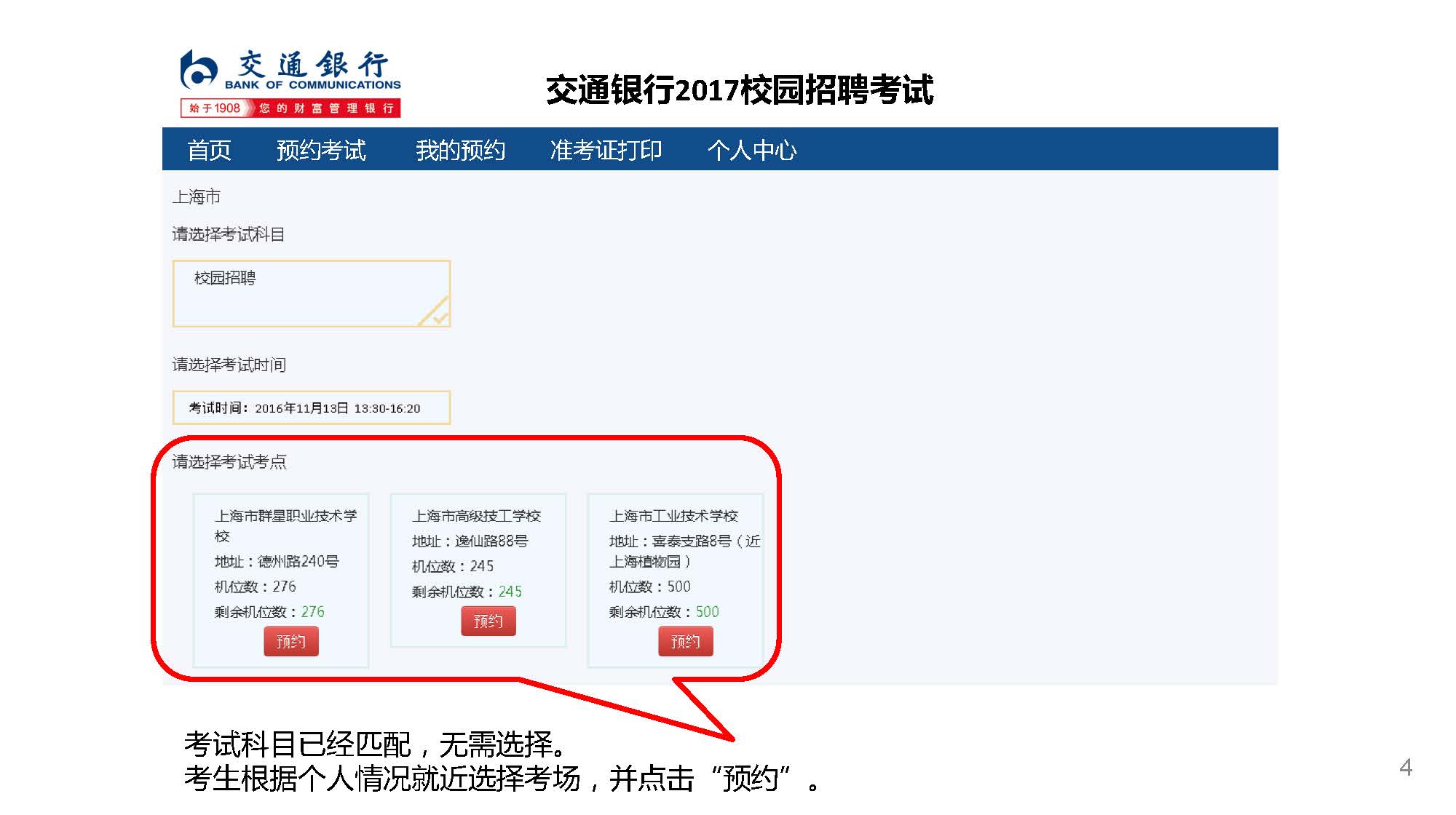 如逾期未預(yù)約,系統(tǒng)將根據(jù)考生申請的參考城市自動分配考場 準考證打印時間:2016年11月8日10:00-2016年11月12日24:00 考場預(yù)約及準考證打印地址:bankcomm.campustest.cn 客服熱線:021-61948899
