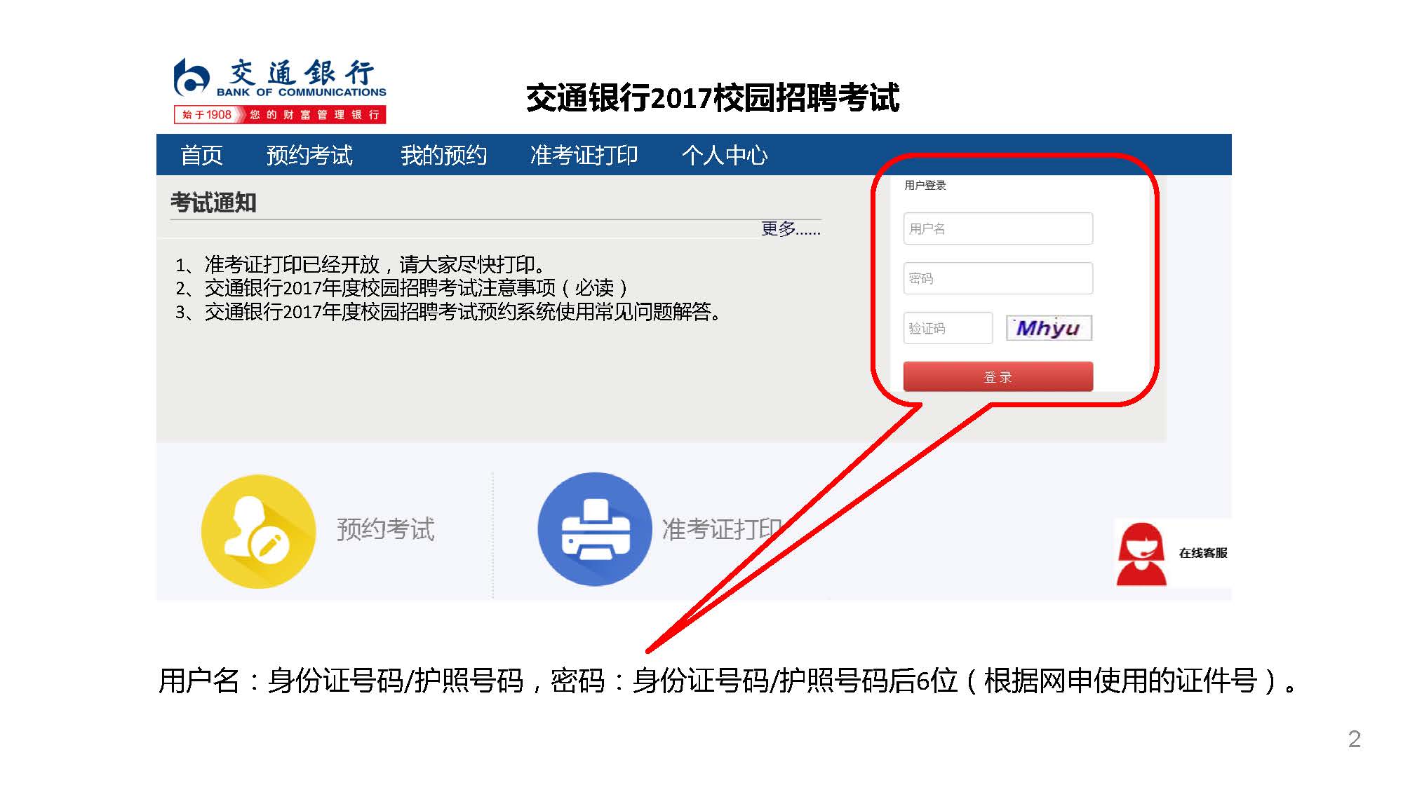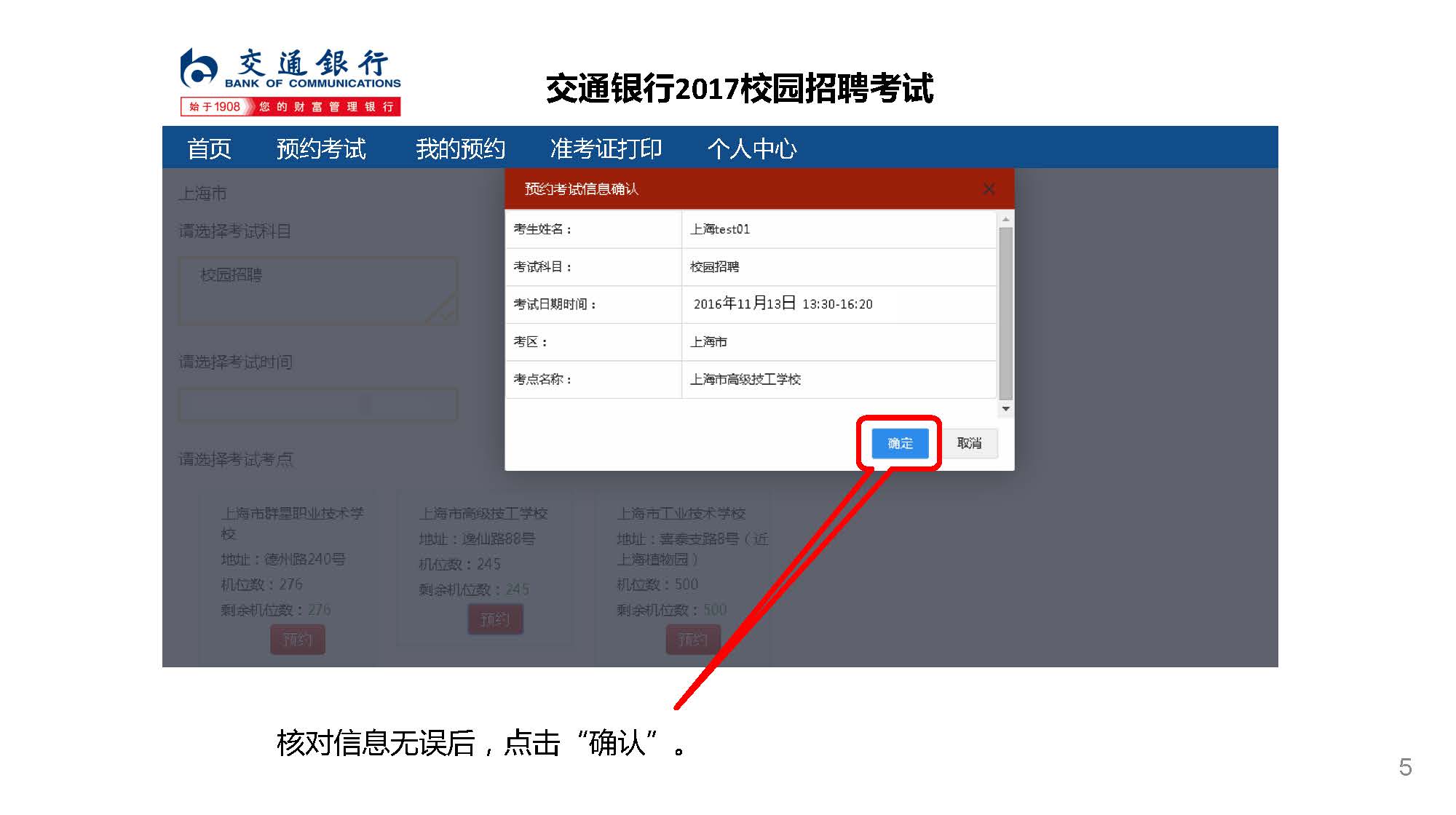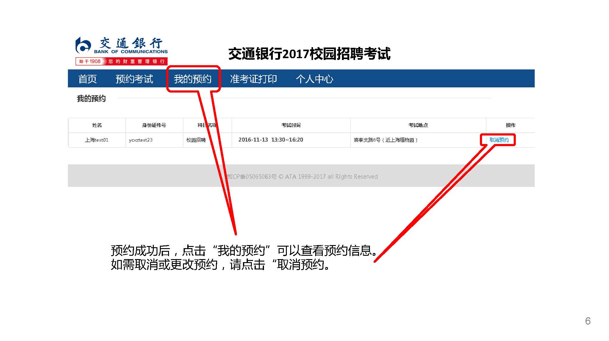 如逾期未預(yù)約,系統(tǒng)將根據(jù)考生申請的參考城市自動分配考場 準考證打印時間:2016年11月8日10:00-2016年11月12日24:00 考場預(yù)約及準考證打印地址:bankcomm.campustest.cn 客服熱線:021-61948899