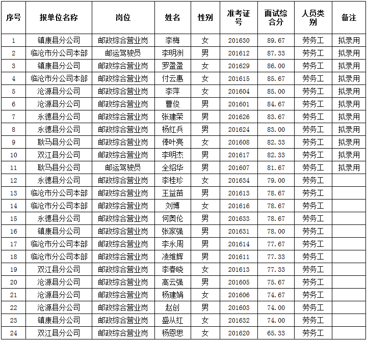 根據(jù)《關(guān)于統(tǒng)一規(guī)范全省郵政企業(yè)市場(chǎng)化用工招聘業(yè)務(wù)流程的通知》云郵分人資函〔2016〕84號(hào)文件的要求,按照“公平、公正、公開(kāi)”的原則,臨滄市郵政分公司勞務(wù)工招聘考試已結(jié)束,經(jīng)紀(jì)檢監(jiān)察審定,現(xiàn)將擬錄用情況進(jìn)行公示。