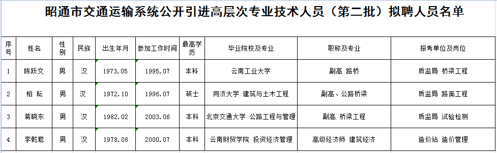 附件:昭通市交通運輸系統(tǒng)2016年公開引進高層次專業(yè)技術人才(第二批)擬聘用人員名單