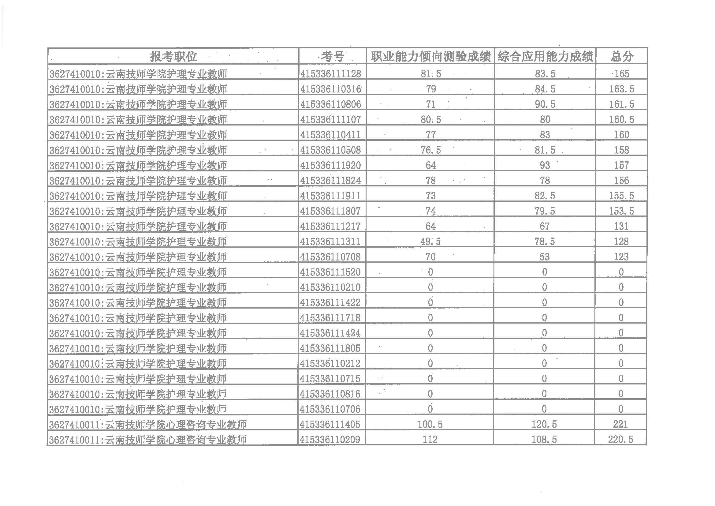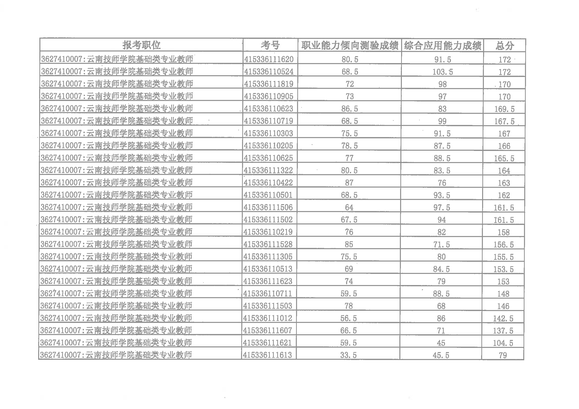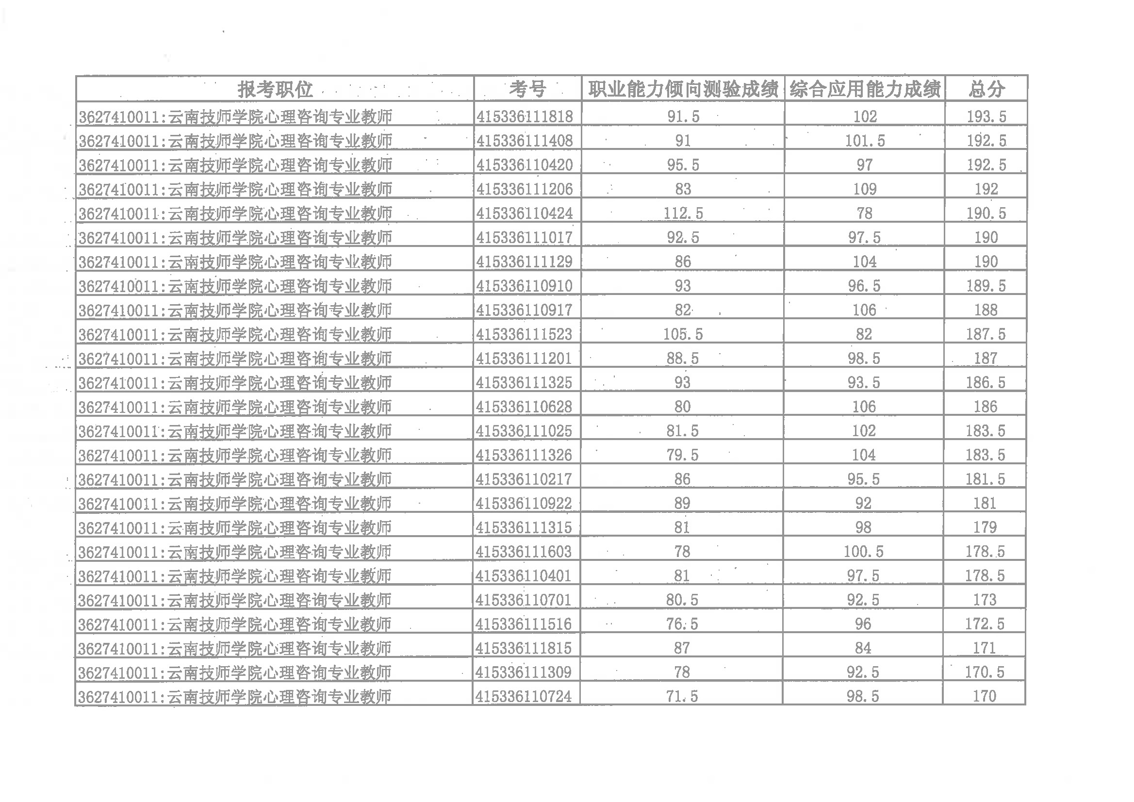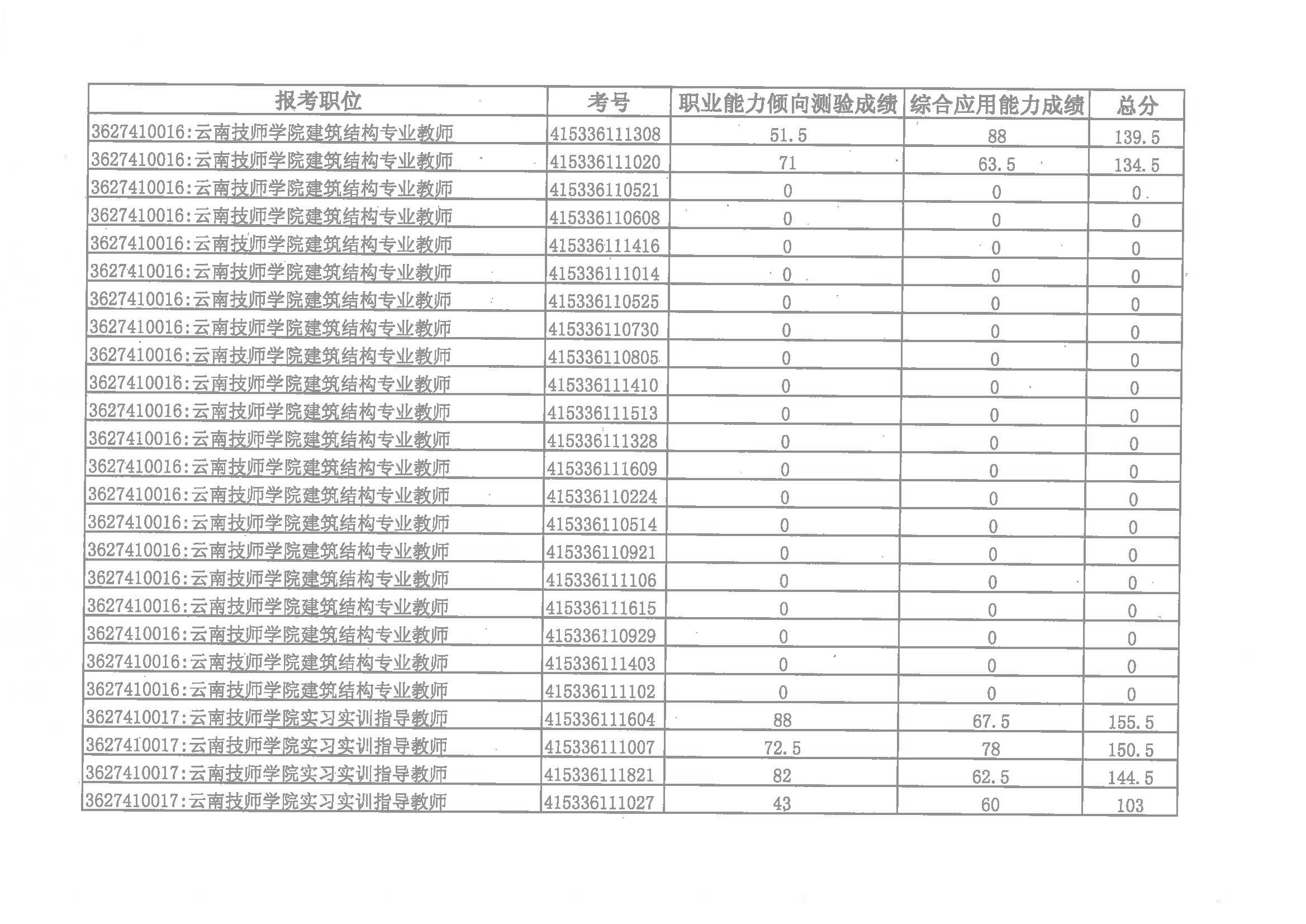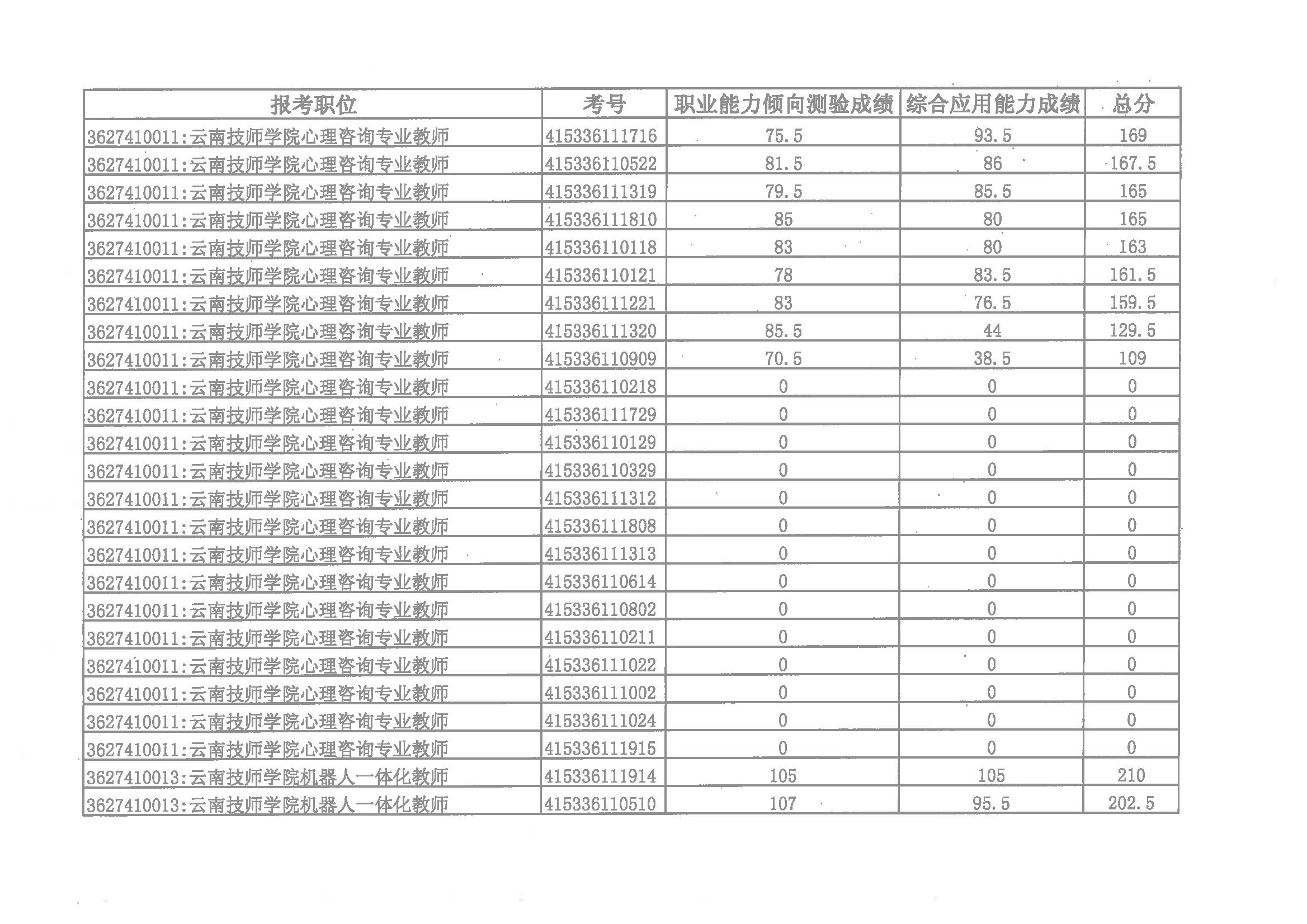 云南技師學(xué)院2016年面向社會公開招聘教師筆試成績公示