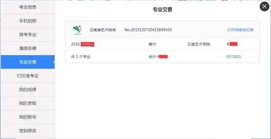 支付成功后,請考生按招生簡章規(guī)定時間登入本系統(tǒng)打印準考證,并到相關(guān)考點確認考試安排,憑《專業(yè)準考證》參加專業(yè)考試。