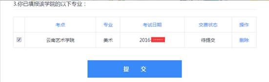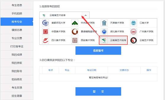 2.非統(tǒng)考(云南藝術(shù)學院??迹┻x擇“云南藝術(shù)學院”。第二步選擇“考點”:省統(tǒng)考和非統(tǒng)考均選擇“云南藝