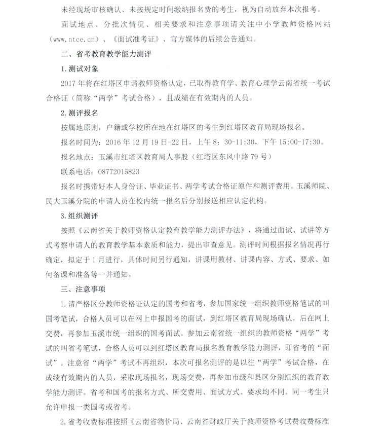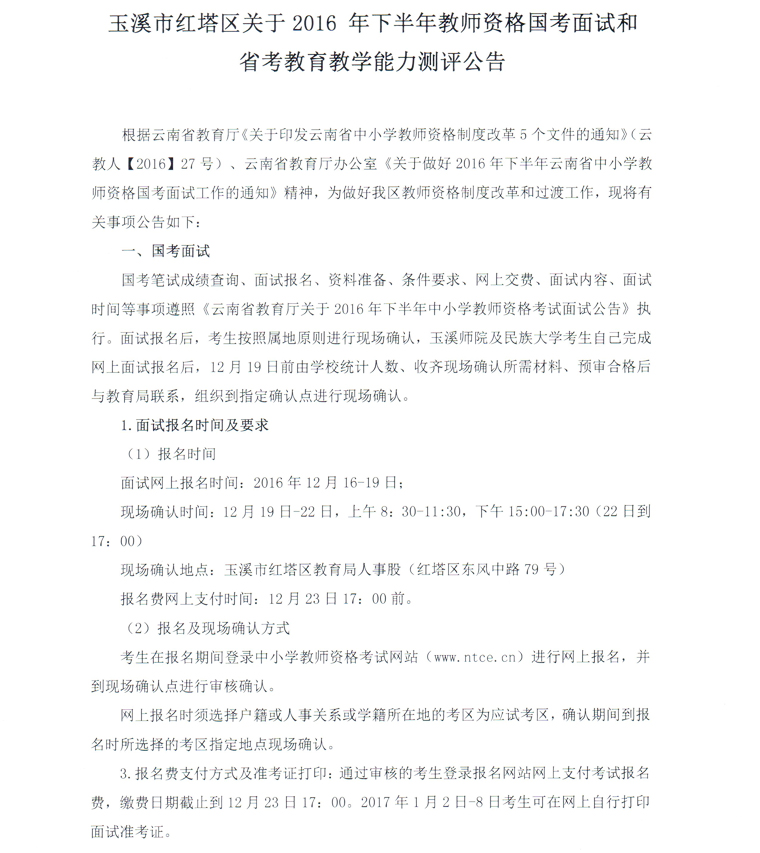 玉溪市紅塔區(qū)2016年下半年教師資格國考面試和省考測評公告