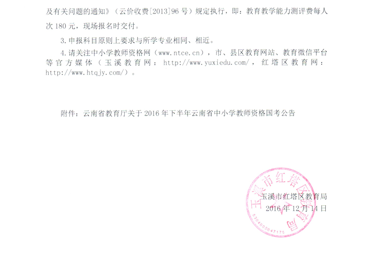 玉溪市紅塔區(qū)關于2016年下半年教師資格