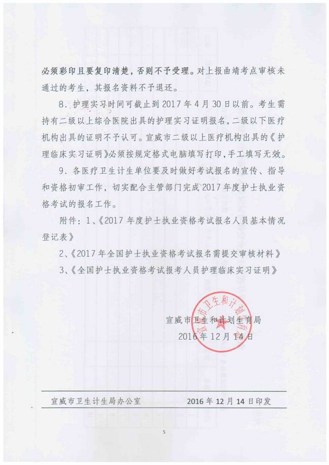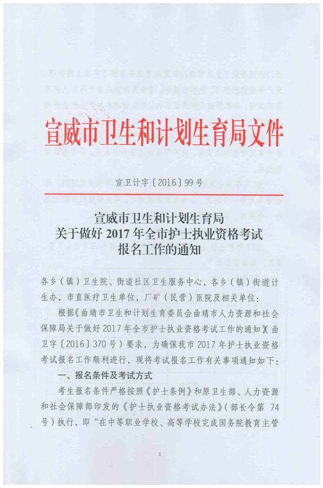 宣威市衛(wèi)生計(jì)生局現(xiàn)場審核時(shí)間為2016年12月19日-2017年1月5日。請各醫(yī)療衛(wèi)生計(jì)生單位及時(shí)通知護(hù)理人員報(bào)名并進(jìn)行現(xiàn)場審核,逾期將不再審核確認(rèn),導(dǎo)致無法參加考試的責(zé)任自負(fù)。
