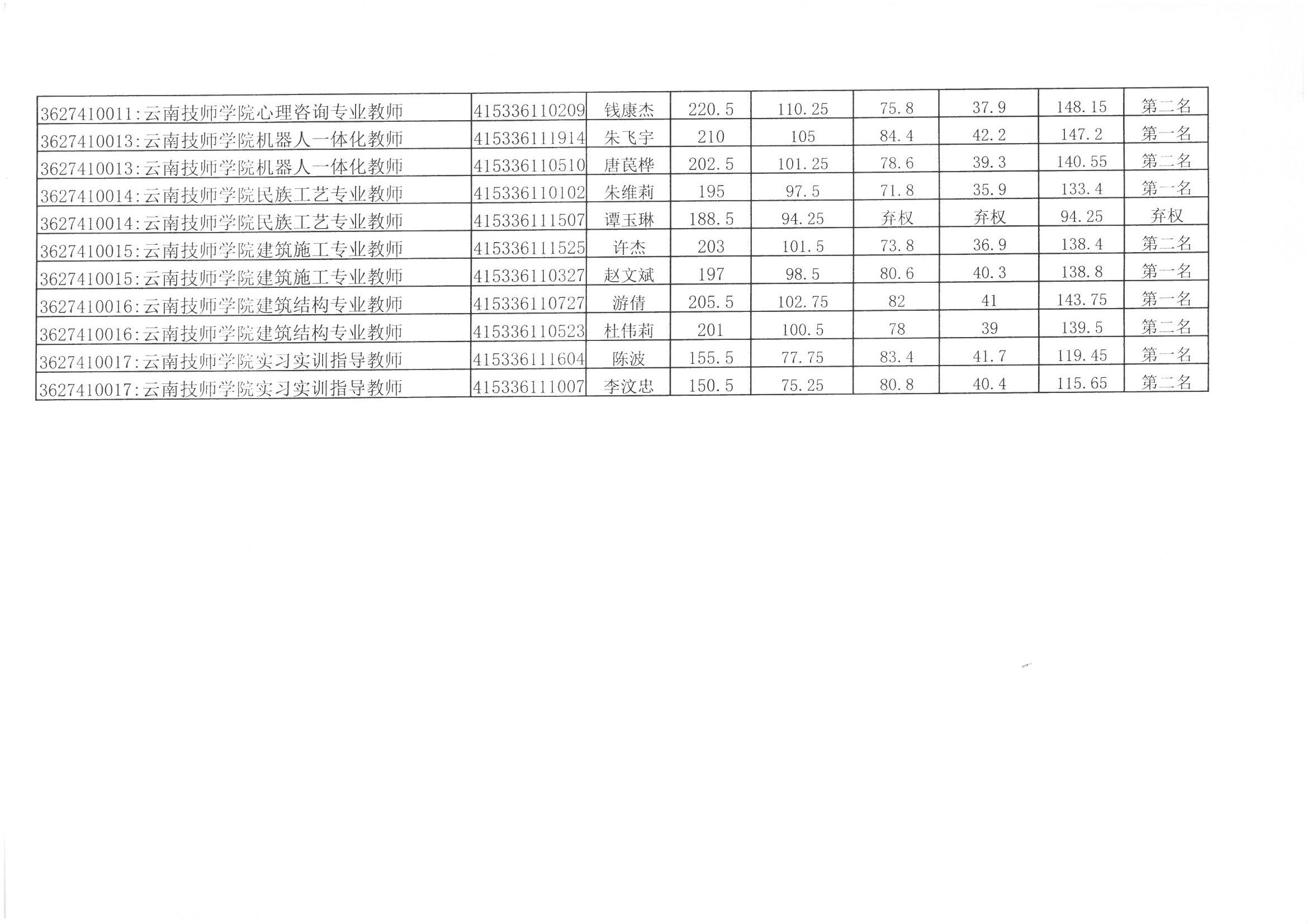 云南技師學(xué)院2016年招聘教師最終成績(jī)公示