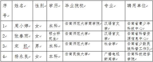 按照《云南省科學(xué)技術(shù)協(xié)會2016年事業(yè)單位公開招聘工作人員公告》,經(jīng)過筆試、面試、考核、體檢,現(xiàn)對周小婷等4名擬聘用人員進(jìn)行公示。對擬聘用人員如有異議,請向省科協(xié)機(jī)關(guān)紀(jì)委反映。
