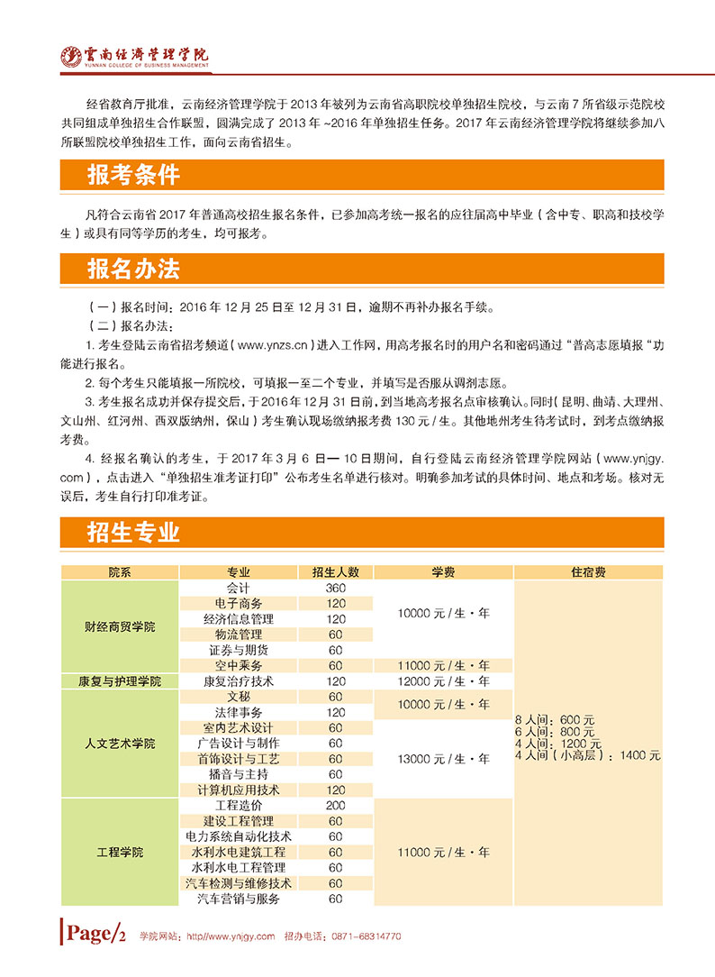 云南經濟管理學院2017年單獨招生簡章