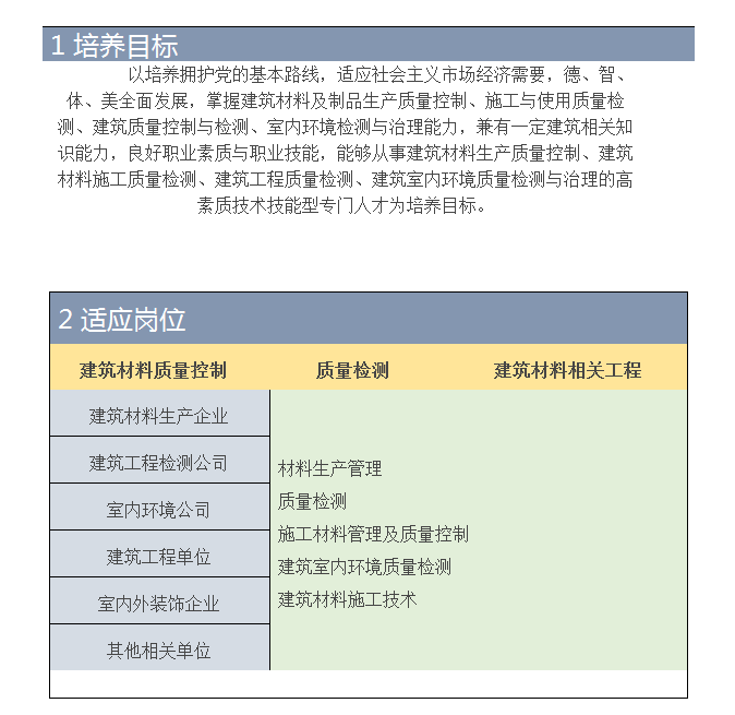 建筑材料工程技術(shù)專業(yè)培養(yǎng)具有必要理論知識、較強(qiáng)實(shí)踐能力、良好職業(yè)道德,能在建筑材料生產(chǎn)、應(yīng)用領(lǐng)域從事中央控制、生產(chǎn)設(shè)備巡檢、材料質(zhì)量控制和檢測以及設(shè)備改造、生產(chǎn)管理等工作的技術(shù)技能型人才。