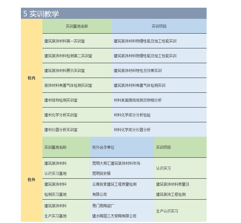 學(xué)院建有融教學(xué)、培訓(xùn)、職業(yè)技能鑒定和技術(shù)研發(fā)于一體的校內(nèi)實(shí)訓(xùn)基地。擁有21個(gè)設(shè)備先進(jìn)、功能齊全、貼近生產(chǎn)實(shí)際的實(shí)訓(xùn)室,其中新型干法水泥生產(chǎn)虛擬仿真實(shí)訓(xùn)室、硅酸鹽X熒光分析實(shí)訓(xùn)室、高分子材料成型加工實(shí)訓(xùn)室的條件在全國同類高職院校中居領(lǐng)先地位。無機(jī)非金屬材料工程技術(shù)專業(yè)實(shí)訓(xùn)基地2009年被評為云南省校內(nèi)示范實(shí)訓(xùn)基地。