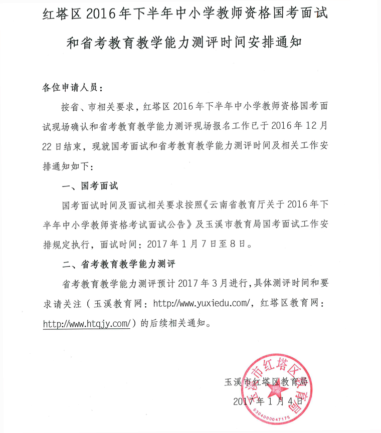 紅塔區(qū)2016年下半年中小學(xué)教師資格國(guó)考面試和省考測(cè)評(píng)時(shí)間通知