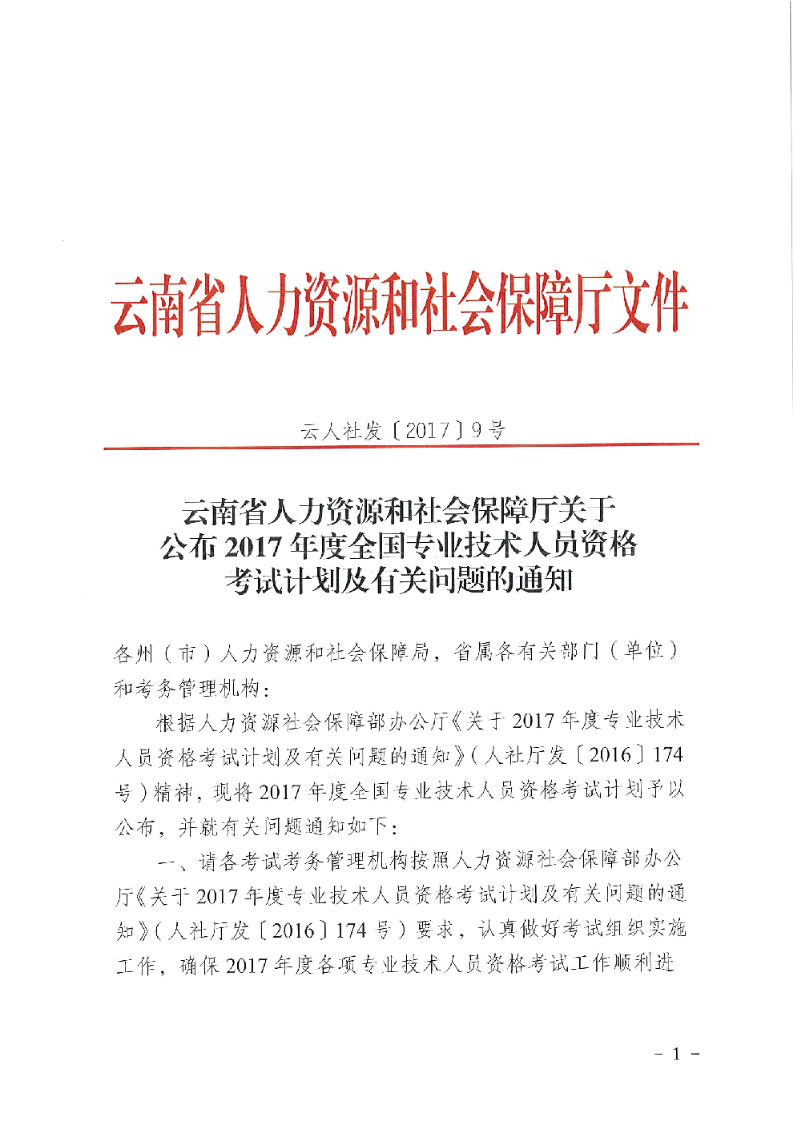 云南省2017年全國專業(yè)技術(shù)人員資格考試計(jì)劃及有關(guān)通知