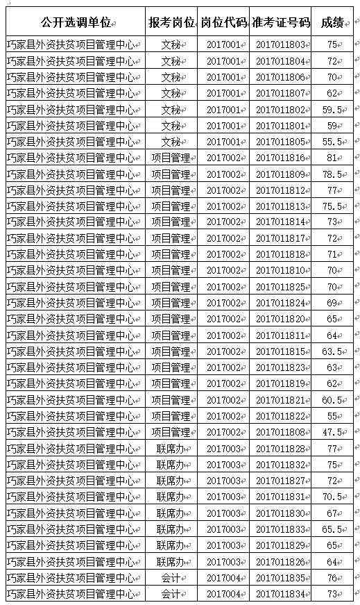 一、 巧家縣扶貧辦2017年公開選調(diào)工作人員筆試成績