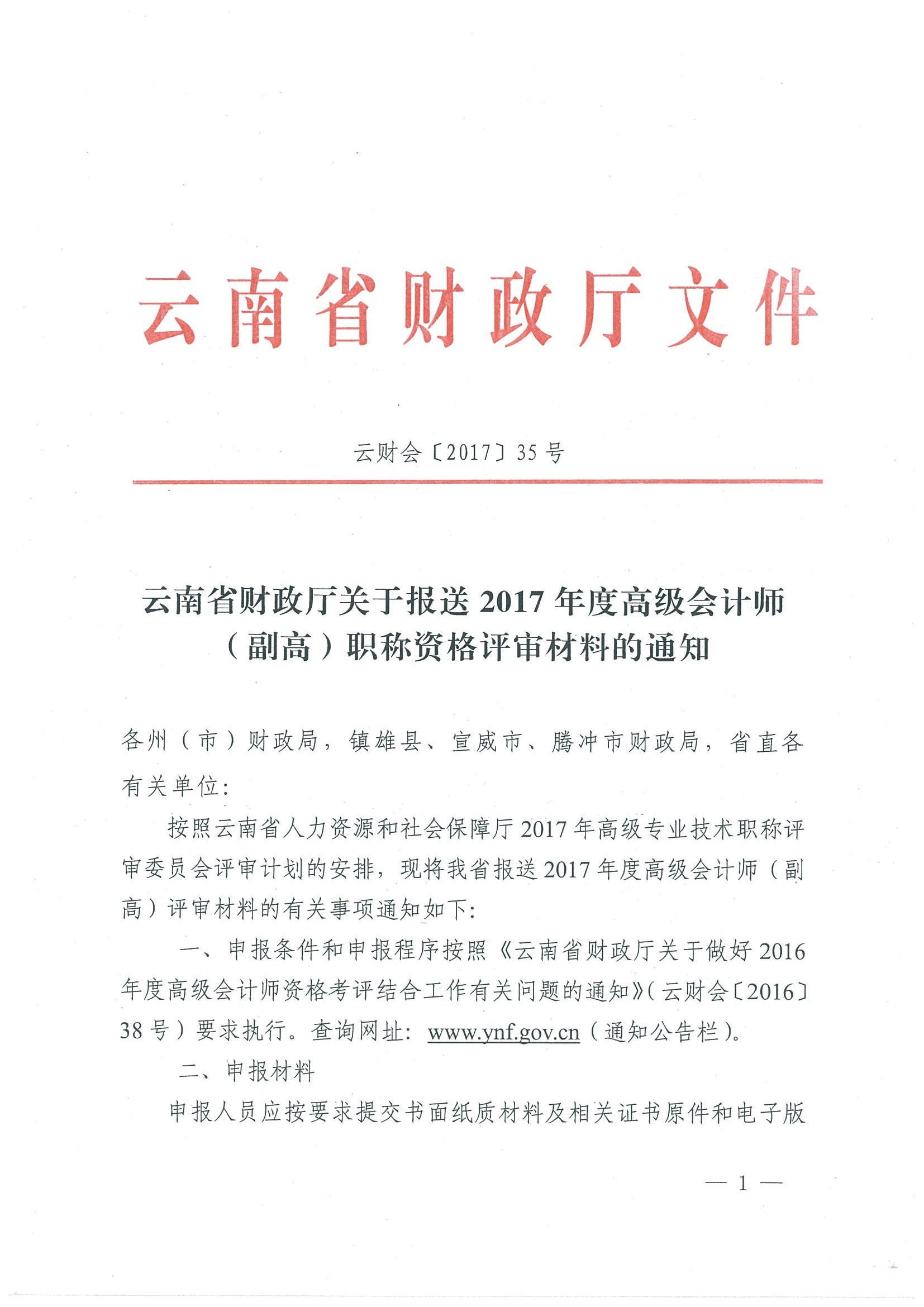 云南省財(cái)政廳關(guān)于報(bào)送2017年度高級會計(jì)師(副高)職稱資格評審材料的通知 (云財(cái)會〔2017〕35號).pdf
